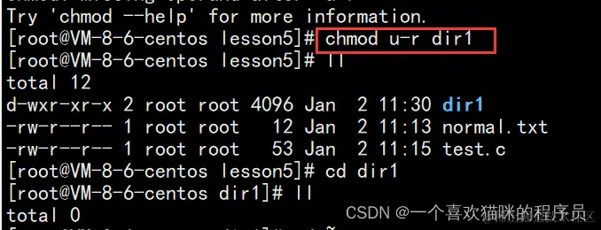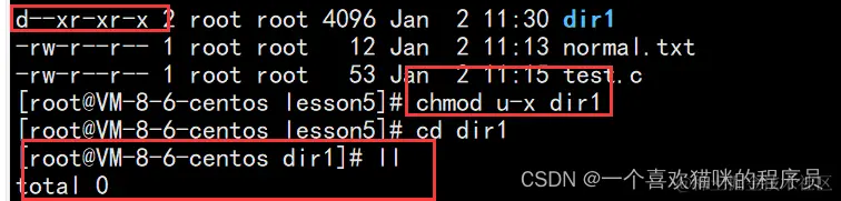 - 对于目录来讲,r代表什么意思呢?在没有r权限的目录下,我们无法查看当前目录下的文件名+文件属性