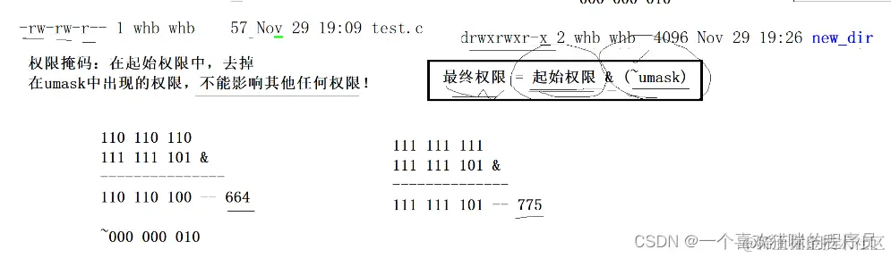 最终权限==起始权限&(~umask)