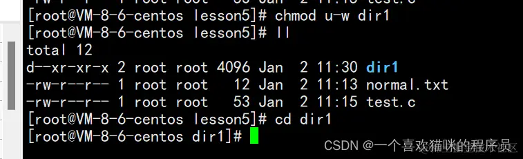 - 对于目录来讲,w代表什么意思呢?在没有w权限的目录下,我们无法直接在该目录下创建新文件和删除文件