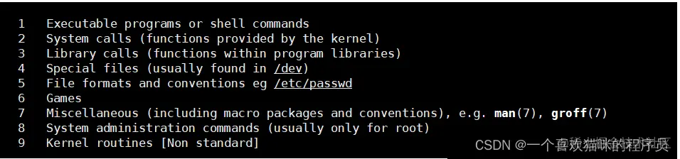 | 5 | 是指文件的格式,比如passwd, 就会说明这个文件中各个字段的含义 |