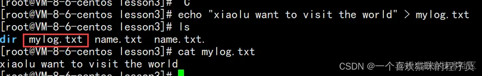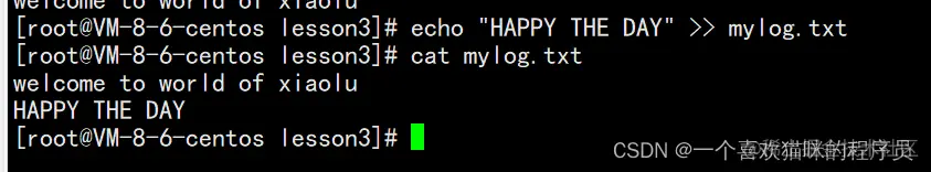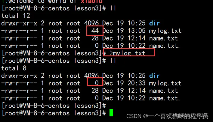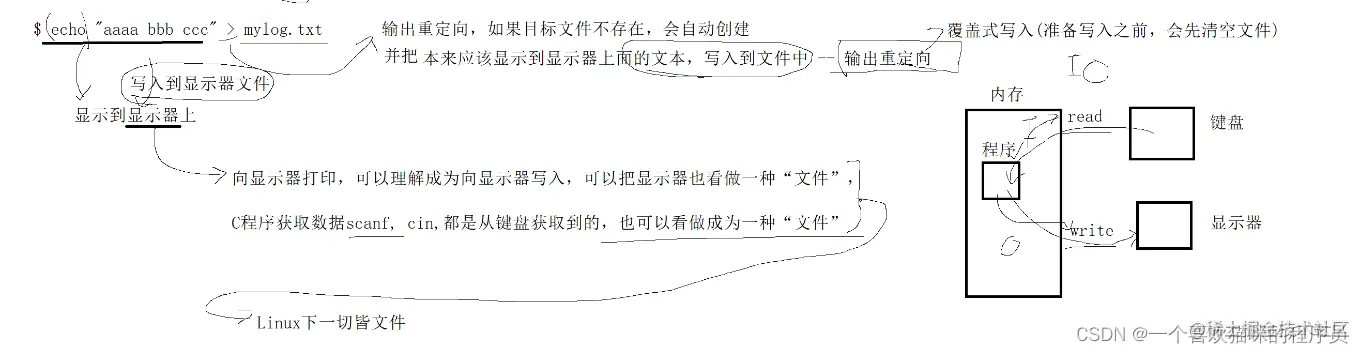 输出重定向,是覆盖式写入(准备写入前,都会清空数据)。