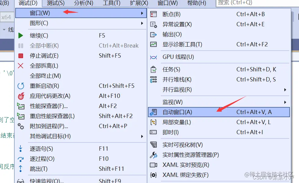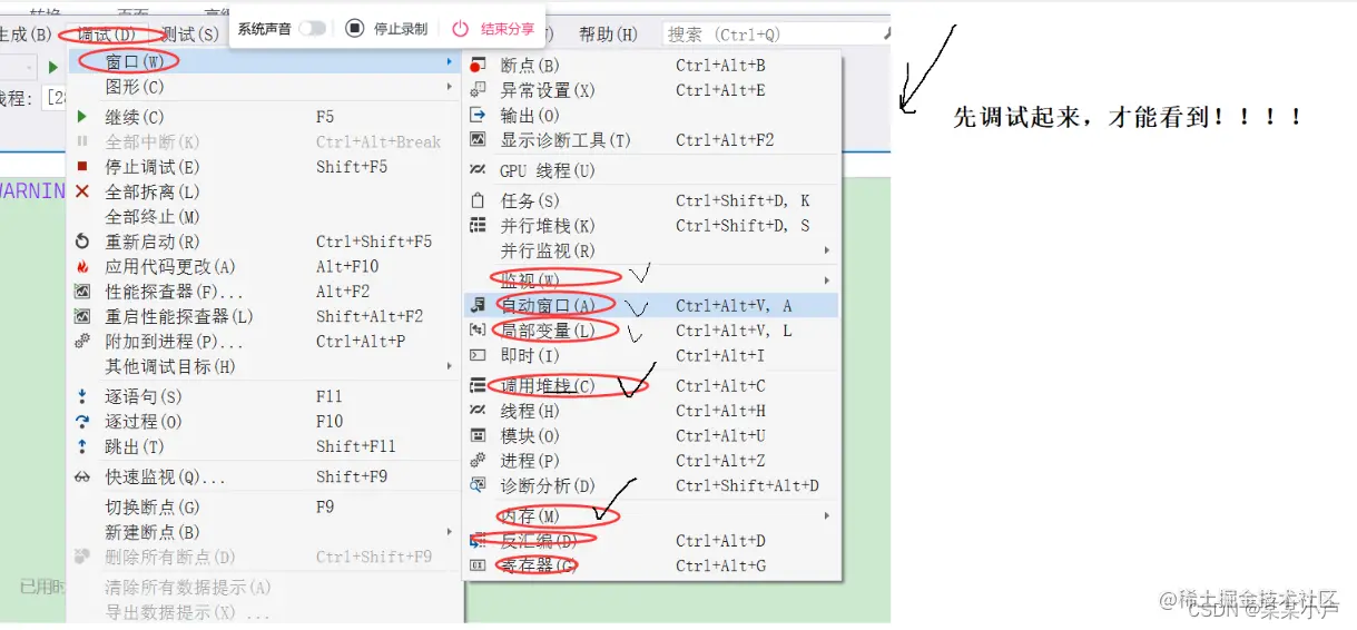 想要进入自动窗口等调试窗口,得先按F10!才会出现那些窗口