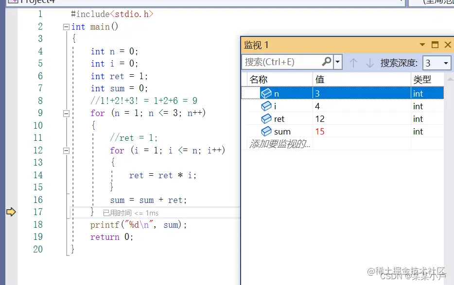 我们是求1!+2!+3!的值,我们通过监视,发现3!的值变为12,而不是6。这里我们分析后,发现上一次算2!的值没有重置保留了下来,所以造成了错误。在11行加一句ret=1就可以了。