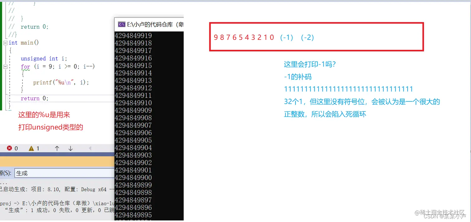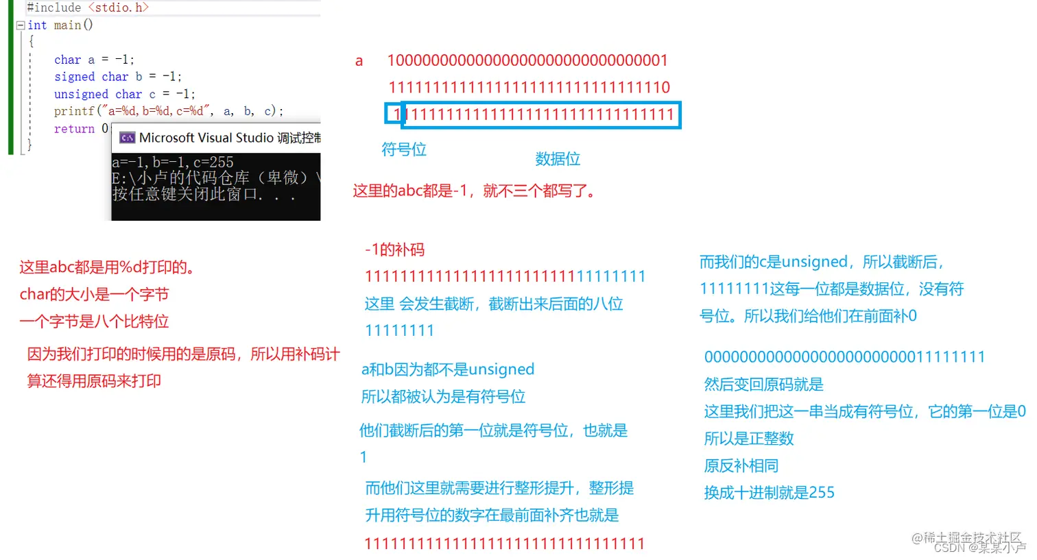 这里比较关键的是:整形数据在存储和计算的时候运用的都是二进制的补码,而打印的时候运用的是原码