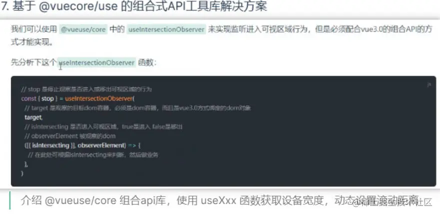 1. 借用vue/use 的 useIntersectionObserver函数, 观察目标容器是否在可视区,如果遇见一些常见的需求可以先看看 @vueuse/core 是否提供,这样可以提高开发效率。