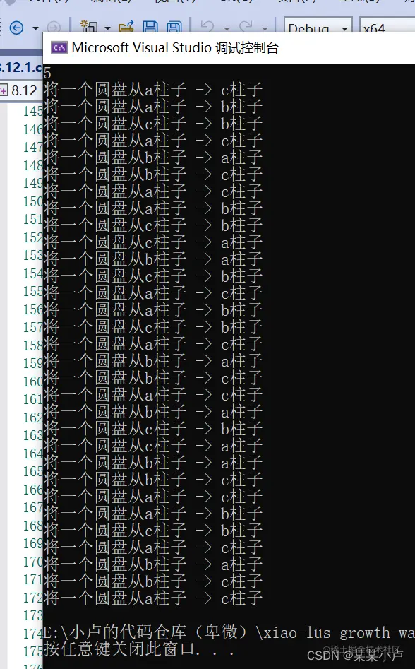 toh(A, B, C, n);//将n个圆盘,借助于B柱子,从A柱子移动到C柱子