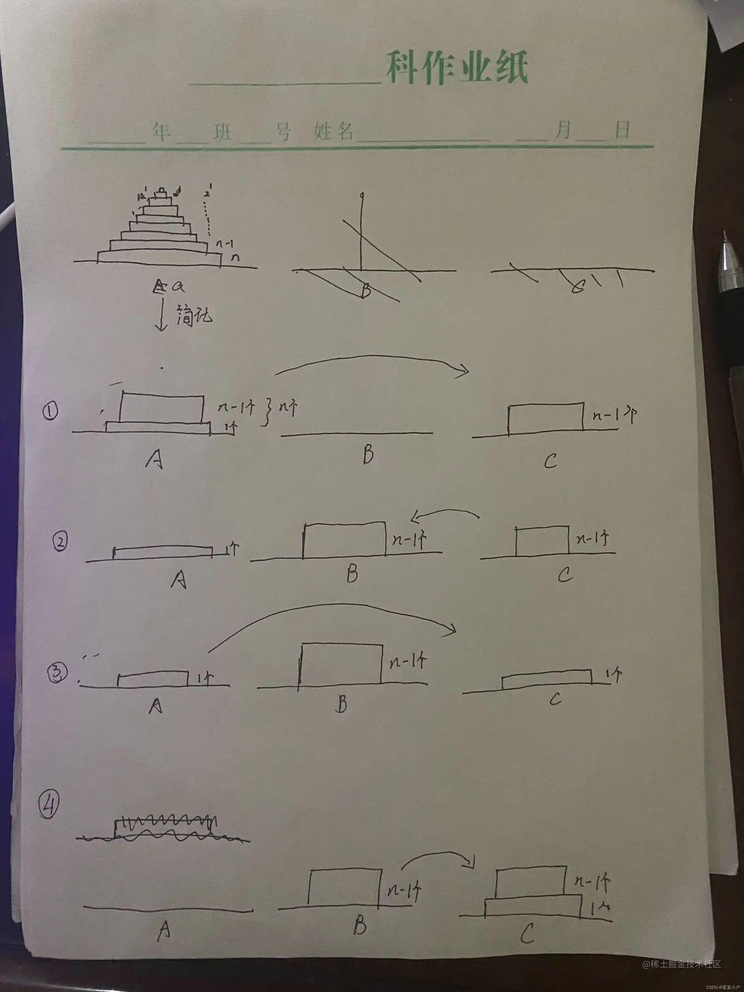 我们要将最下面的盘子放到C,我们得先将n-1个盘子(我们这边把n-1个看成一个整体)放到B,但我一次只能拿一个盘子,所以我们得先将n-1个盘子借助C放到B中,然后就完成了B有n-1个盘子,C有1个盘子。然后B的n-1个盘子我们借助A拿到C上面,这样就完成了一套操作。(我花了图,你们参考一下下图理解一下!画的丑见谅啊)