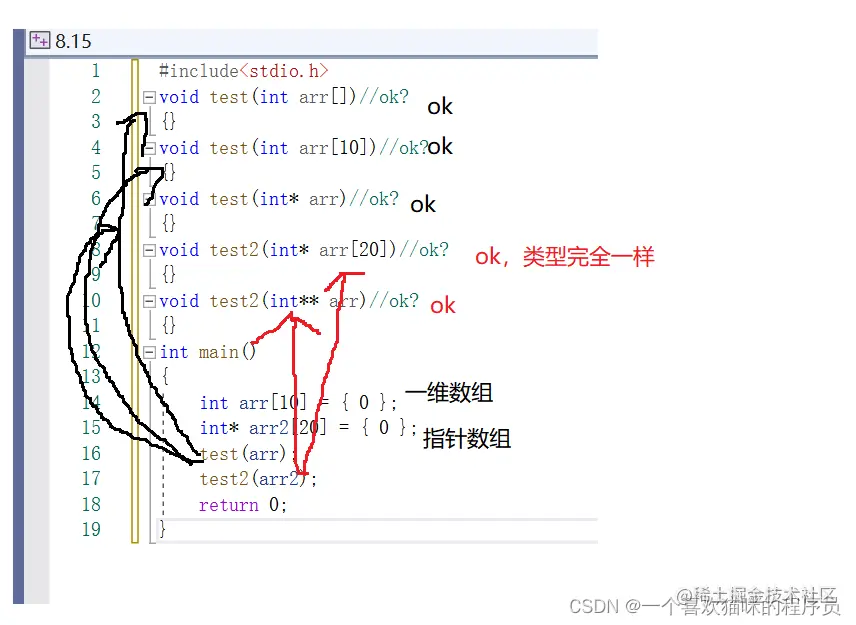arr2为首元素地址指向int*类型,而int**arr为指向一个一级指针的指针。两种相同!!!