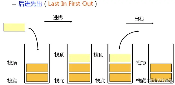 栈是一种遵从先进后出 (LIFO) 原则的有序集合;新添加的或待删除的元素都保存在栈的末尾,称作栈顶,另一端为栈底。在栈里,新元素都靠近栈顶,旧元素都接近栈底。