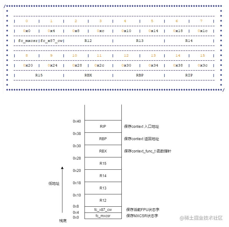 协程执行的过程,依赖两个关键要素:协程栈和寄存器,协程的上下文环境其实就是寄存器和栈的状态。实现上下文切换的核心就是实现保存并恢复当前执行环境的寄存器状态的能力。