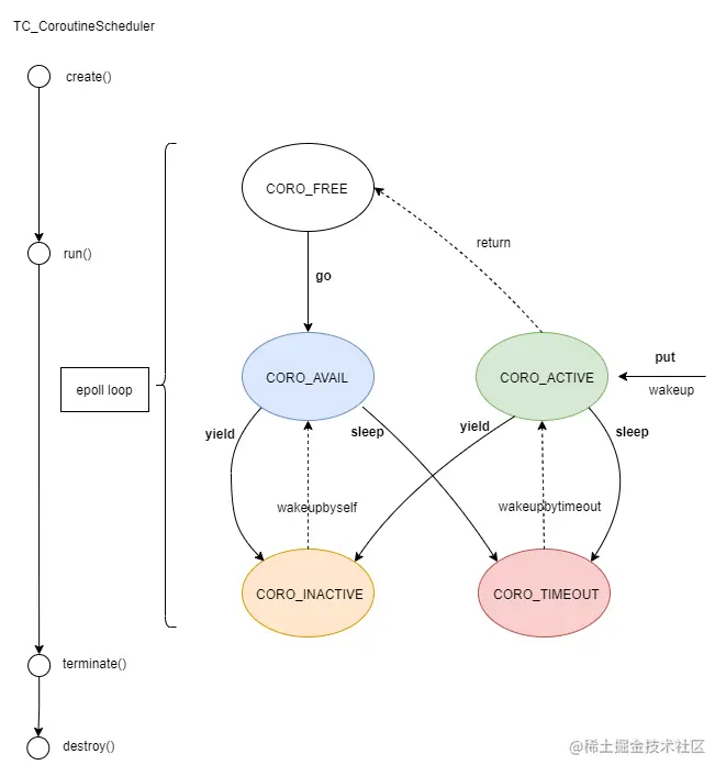 协程调度:目的是控制协程的启动、休眠和唤醒,实现了 yield, sleep 等功能,本质就是实现协程的状态机,完成协程的状态切换。Tars 协程分为 5 个状态:FREE, ACTIVE, AVAIL, INACTIVE, TIMEOUT