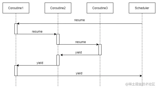 下图演示了非对称协程的调度权转移流程。协程可以有两个操作,即resume和yield。resume表示转移CPU给被调用者,yield表示被调用者返回CPU给调用者。