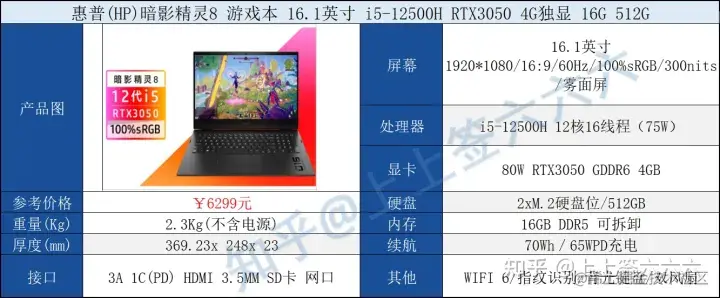 惠普(HP)暗影精灵8Pro 16.1英寸游戏本电脑(12代酷睿i5