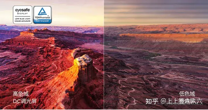 完整色域覆盖,色 深丰富渐变,能还原画面标准色彩。一般高色域屏幕都会标明100%sRGB,下图就是同景不同色域显示的差别。