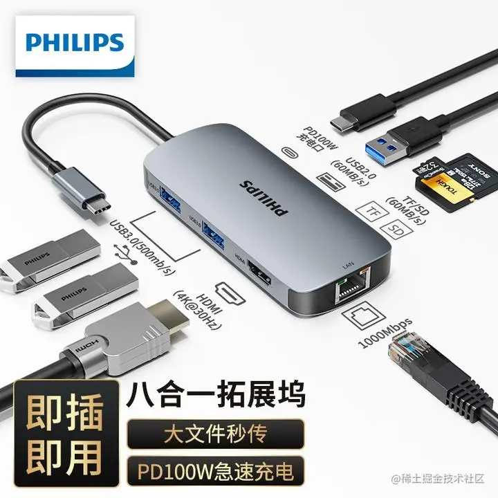 飞利浦扩展坞八合一【USB、HDMI、网口、PD、TF/SD】