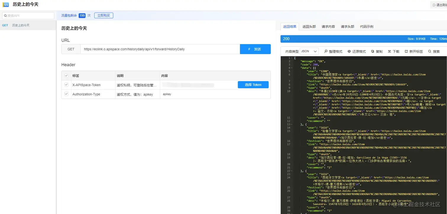 点击免费试用成功后,系统会自动进入 API 的测试界面,如下图,我们只需要点击发送就能获取历史上的今天的发生的事件。