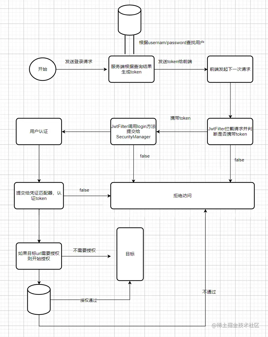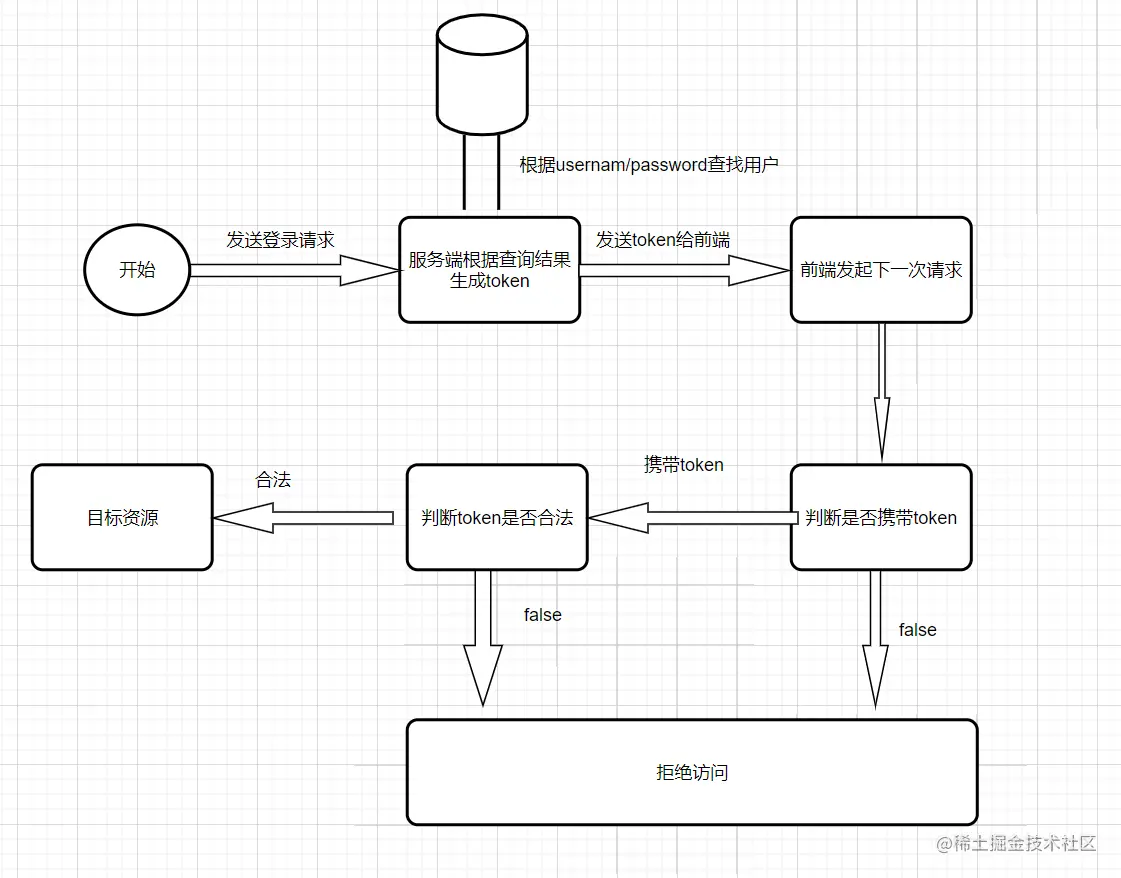如何使用:当用户登录系统后,服务端给前端发送一个基于用户信息创建的token,然后在此后的每一次前端请求都会携带token。服务端通过拦截器拦截请求,同时验证携带的token是否正确。如果正确则放行请求,不正确则拒绝通过。 思路流程图: