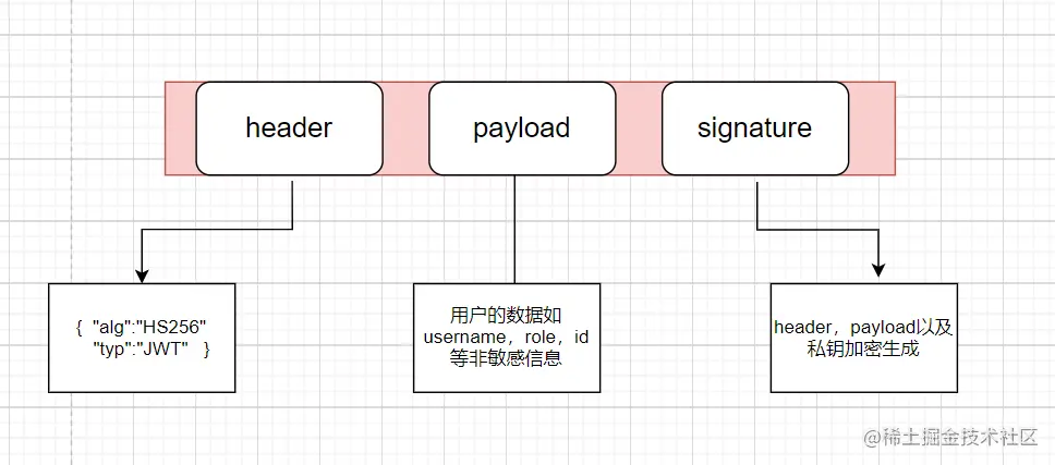 在前后端分离的项目中,由服务器使用的会话管理session无法满足需求。需要一种技术做会话管理。因此选择JWT。 Json web token (JWT) : 是目前流行的跨域认证解决方案,是一种基于 Token 的认证授权机制。 JWT的数据结构分为三部分 header payload signature。 这三部分通过.连接,如下