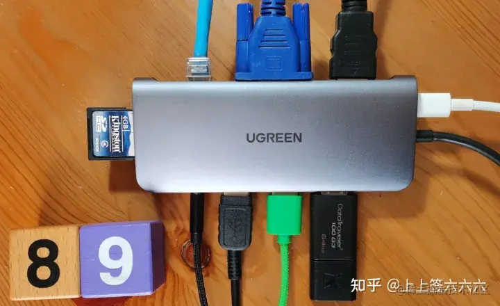 对价格比较敏感,同时使用频率一般的,推荐国产品牌绿联九合一扩展坞,下图是接满设备的图示,支持HDMI/VGA/网口/PD充电/USB/sd/TF/3.5MM耳机线