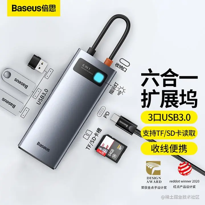 倍思 Type-C扩展坞USB-C转HDMI转接头6合一适用华为/ip