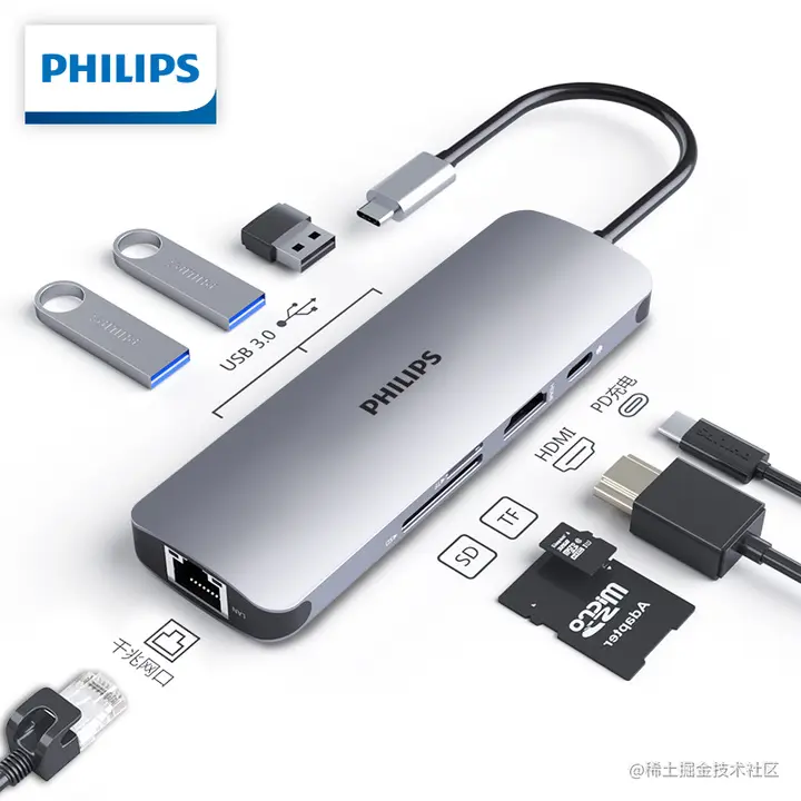 飞利浦八合一扩展坞【USB3.0、HDMI、千兆网口、SD卡