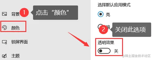 - 在左侧面板中,单击 【颜色】 选项,将 【透明效果】 滑块移至关闭状态;