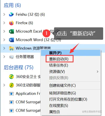 2.在任务管理器中,找到 【Windows资源管理器】 ,右键单击并选择 【重新启动】 ;