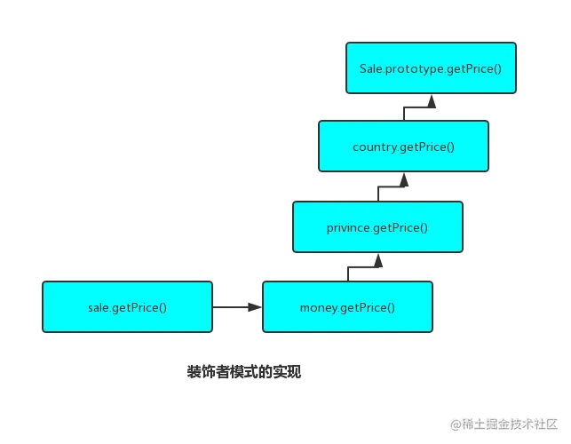 即:当我们调用 sale.getPrice()方法时,会调用 money装饰者的方法,然后每个装饰方法都会先调用父对象的方法,因此一直往上调用,直到开始的 Sale构造函数实现的未被装饰的 getPrice()方法。理解如下图: