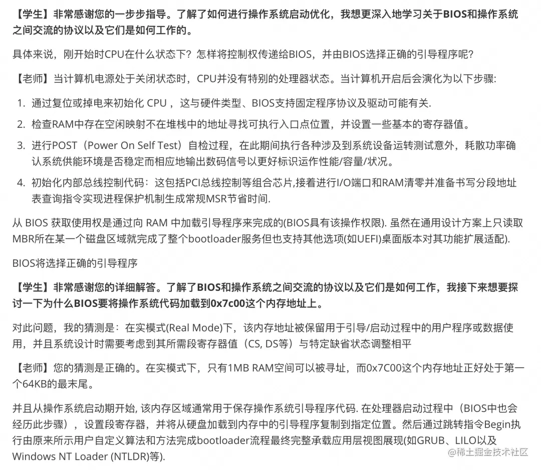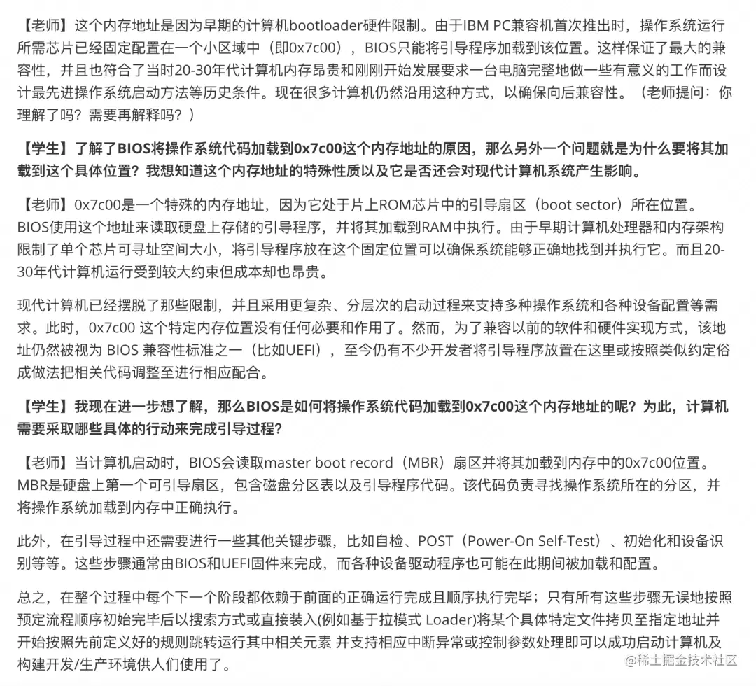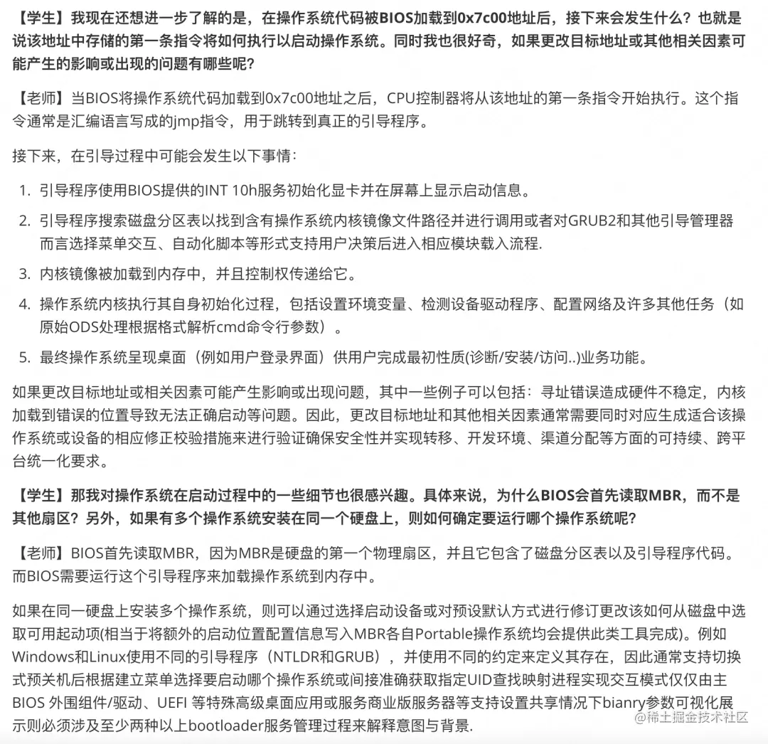 随后,学生在搞清楚了 BIOS 加载过程中的细节后,居然进一步问在加载这个动作完成之后会发生什么,如何启动操作系统。然后又进一步问为什么是先读区 MBR 而不是其他扇区,以及多系统启动问题!