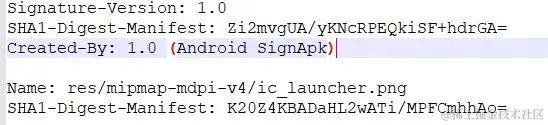 因为这个JarEntry 对应着MANIFEST.MF文件,查看manifest的write方法,即为写文件,可知最后写入MANIFEST.MF是在此处完成。查看META-INF/MANIFEST.MF文件,发现其内容正是记录apk各文件的数据摘要: