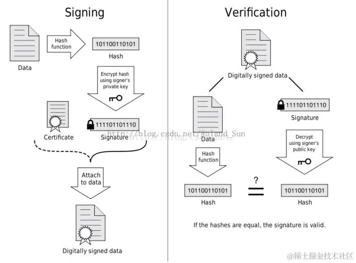 综上所述,总结一下,数字签名和签名验证的大体流程如下图所示: