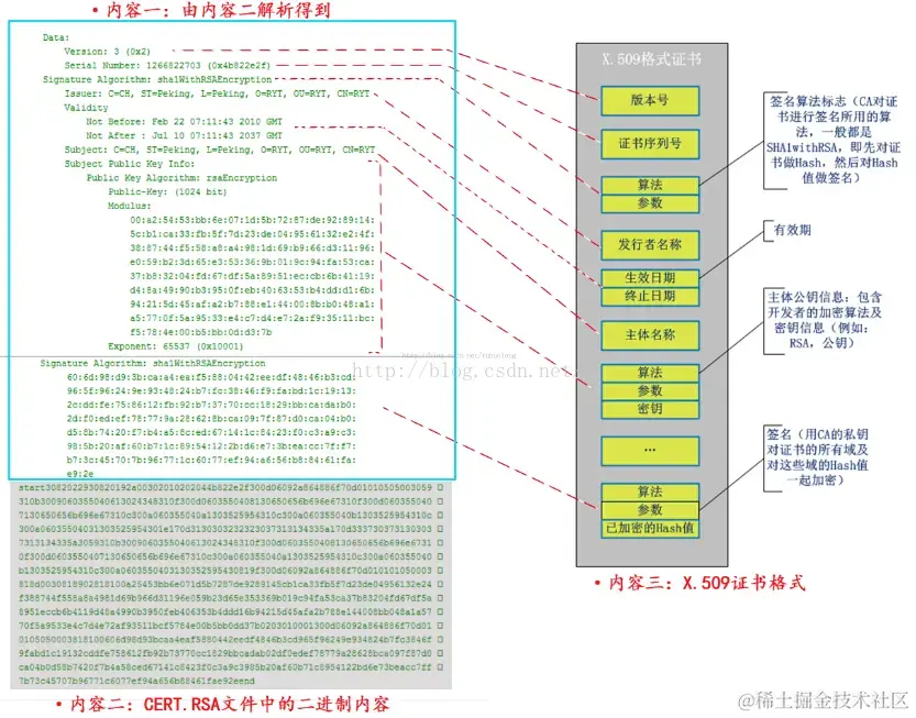 数字证书,一般包含以下一些内容: 证书的发布机构(Issuer) 证书的有效期(Validity) 消息发送方的公钥 证书所有者(Subject) 数字签名所使用的算法 数字签名