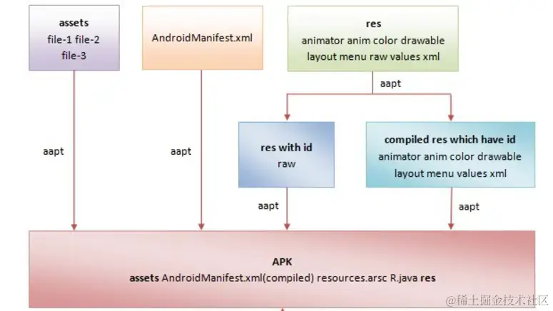 其它:其它资源均会被分配资源id,且xml文本资源均会被编成二进制文本。如果解压一个apk,找到res/value文件夹下的任意一个文本,打开后发现变成乱码。