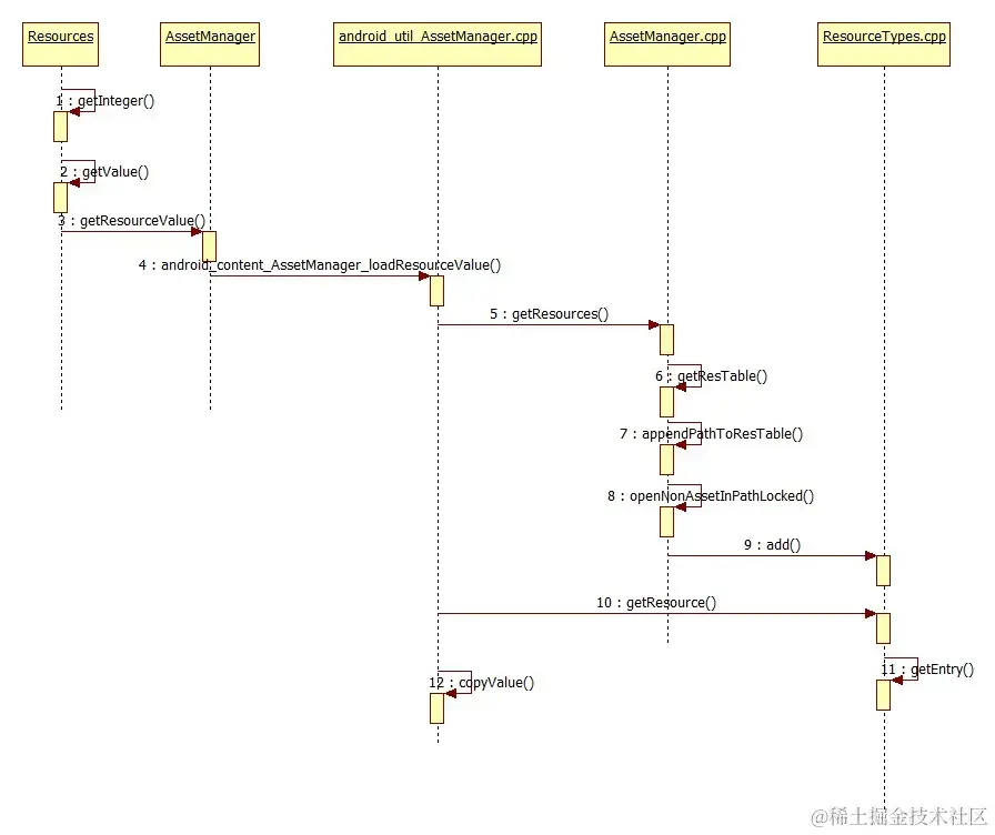 第4步,android_util_AssetManager.cpp文件中,调用android_content_AssetManager_loadResourceValue方法,此方法是整个过程中的关键,负责查找资源并最终将返回值复制到java对象TypedValue中。