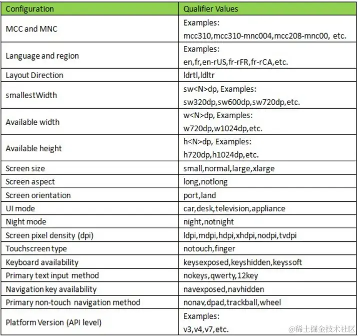 资源匹配规则比较简单。资源匹配一共有18个维度,在匹配时,根据当前的配置,去掉与配置相冲突的选项(比如语言、方向),然后根据维度的优先级,选择最合适的资源: