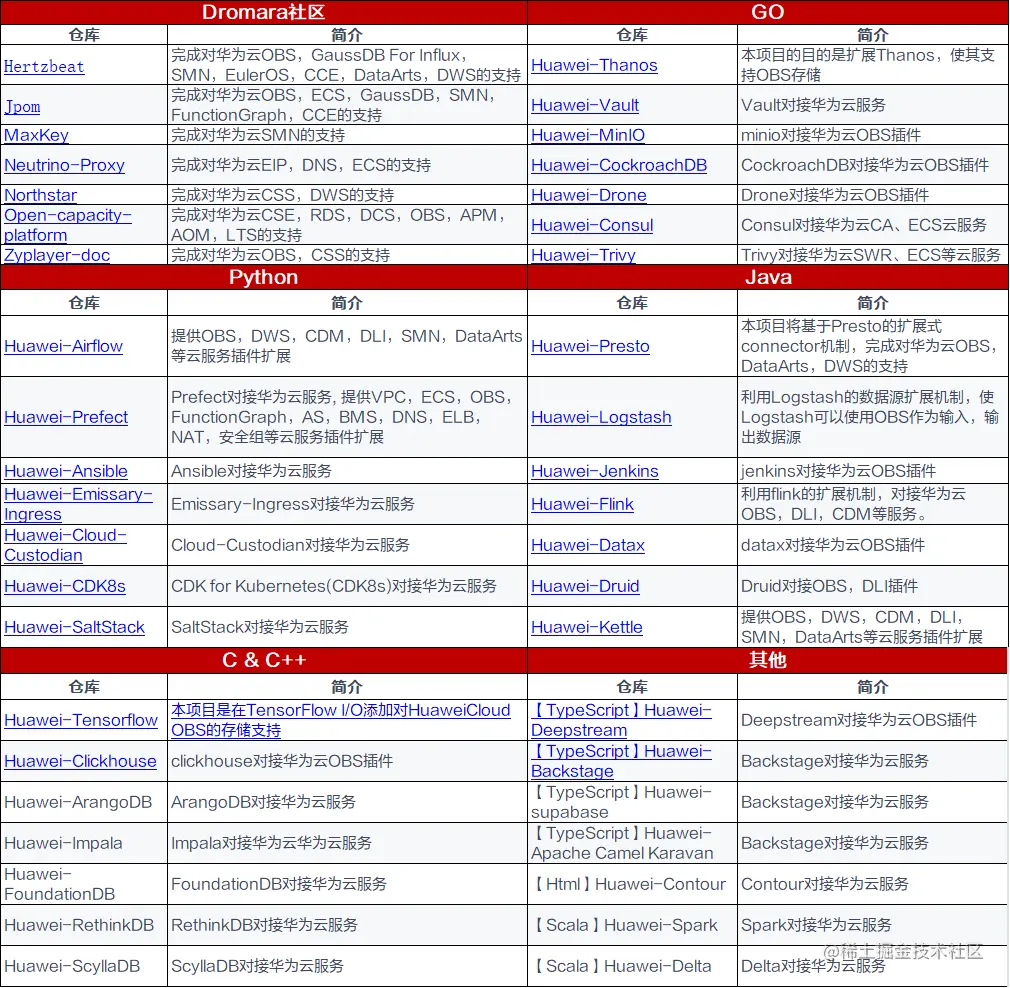 开发者将开源软件工具、开源应用和开源组件与华为云对象存储OBS、数仓DWS、云容器CCE等云服务对接,同时基于Terraform模板,上架到华为云云商店,支持其他开发者一键部署使用开源组件 ,我们称为“开源xxx for HuaweiCloud”。 下图为华为云开源&开发者示例代码仓的示例,涵盖Dromara社区、Java、Go、Python、C&C++及其他开源类项目,数量超过100。感兴趣的开发者可以点击:华为云开源&开发者示例代码仓,了解更多。