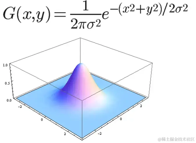 由于图像是二维的,需要根据二维正态分布函数来计算权重值,它的公式以及曲线如下: