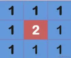 如图所示,2是中间点,周围点都是1。中间点取周围点平均值,就会变成1。在数值上,这是一种"平滑化"。在图形上,就相当于产生"模糊"效果,"中间点"失去细节。