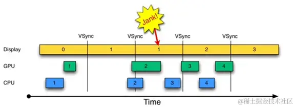 如上图,第1帧在显示时,GPU并没有准备好第2帧数据,导致第1帧数据连续显示两次,导致不流畅、卡顿。应用需要减轻UI线程负担,将耗时工作放入工作线程中,同时精简绘制工作,保证16ms内可以完成一帧绘制。