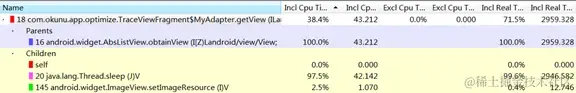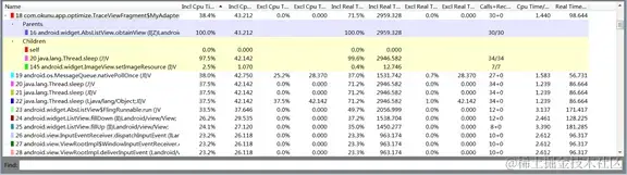 Adapter类的getView方法中调用了sleep方法以及setImageResource方法,而sleep方法耗时占用整体耗时的97%,如此,问题原凶已找到。