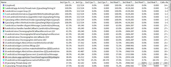 使用DDMS采集数据分析,按Incl CPU Time降序排列,traceview面板如下: