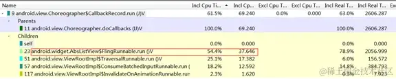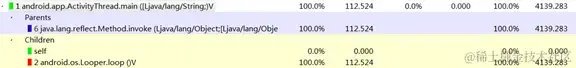 因为Incl CPU Time是包含内部调用的其它函数时间的,所以从上到下,花时间最多的就是虚拟机相关方法以及ActivityThread的main方法(应用线程启动的入口方法)等。点击每一个方法,均可以看到此方法自身花费时间、调用其它方法花费时间以及它的前一调用方法。一般来说通过跟踪调用链,可找到对应问题所在。