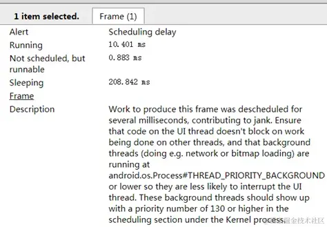 Systrace也是可以直接点击红色帧(红色帧即是卡顿帧),查看红色帧的一些基本情况,也能看到对于红色帧的处理意见。