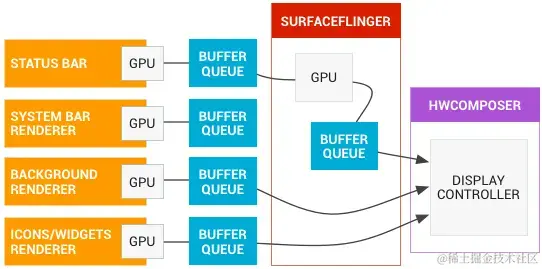 左侧的对象是生成图形缓冲区的渲染器,如主屏幕、状态栏和系统界面。SurfaceFlinger 是合成器,屏幕负责显示合成界面。