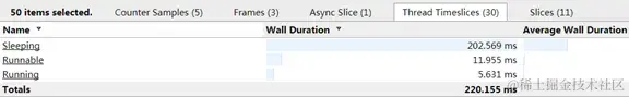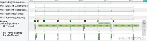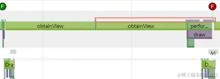 Systrace有几个需要注意的点,首先就是cpu的状态问题。例如上图红框所示,obtainView方法上是无色的,而右边小部分确是蓝色或绿色,无色则代表cpu此时在睡眠状态,蓝色或绿色表示cpu处于运行状态。如上图所示,则可知此时cpu状态异常,是否是调用了sleep方法导致这一帧卡顿了?可使用左键滑动选中一段距离,查看这段距离的cpu情况: