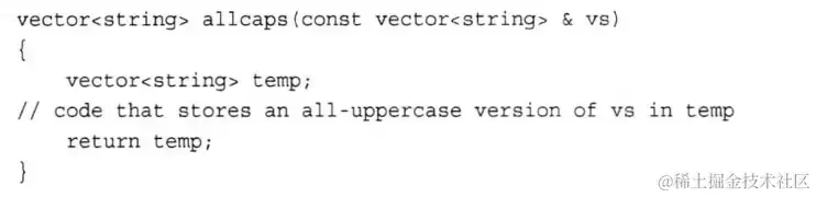 函数 allcaps 并没有返回引用或指针,直接在函数体内构造了一个临时变量并且返回,临时变量是会被删除的。但vstr_copy2依然会调用复制构造函数来构造一个新的对象,如此,上述过程中,先是构造了一个临时变量 temp,再调用复制构造函数生成了一个新对象 vstr_copy2,再删除了temp,temp的生命周期非常非常短,没有什么作用,中间还产生了大量的内存操作。是否可以避免多作的内存操作呢?