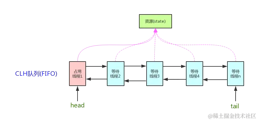它维护了一个volatile int state(代表共享资源)和一个FIFO线程等待队列(多线程争用资源被阻塞时会进入此队列)。当state值为1时,则表示当前已经有线程取得了锁,其它线程则需要被阻塞。反之,如果state值为0,则表示锁还没有被任何一个线程获取。