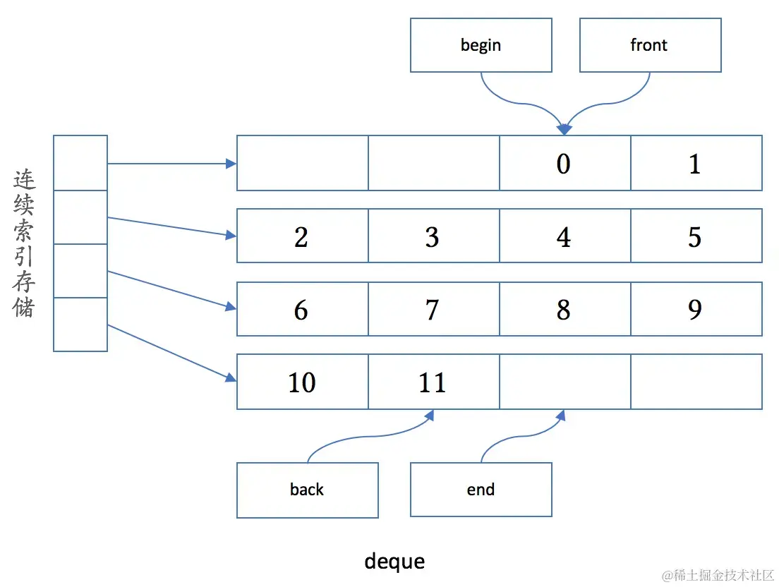 由于每一段存储大小相等,deque 支持使用下标访问容器元素,大致相当于 index[i / chunk_size][i % chunk_size],也保持高效。