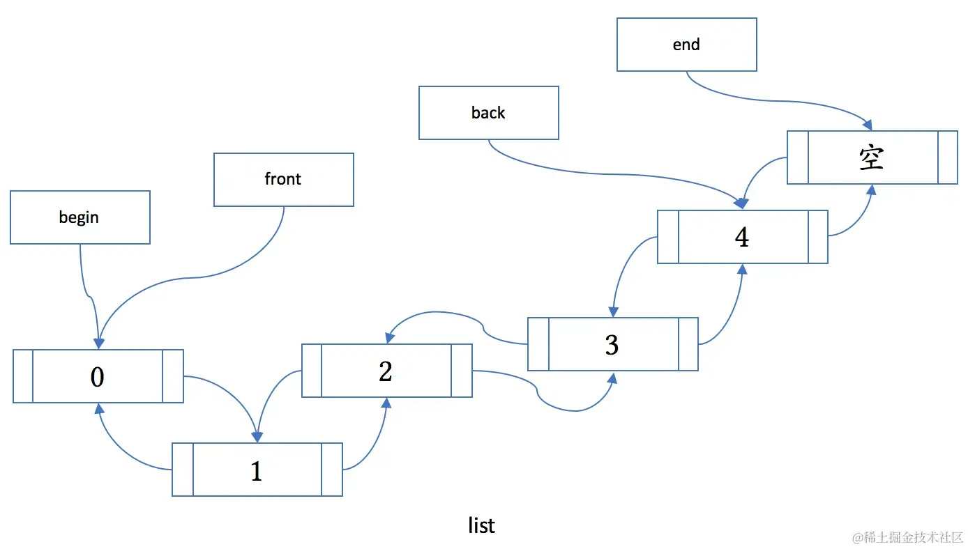 重点,list在c++中是一个双向链表,作为链表,自然它的插入和删除效率非常的高,但因为内存不连续,查找的效率就很差,每次查找都是遍历。如果你需要一个经常插入删除的情况,list会是一个好的选择。它的内存布局如下: