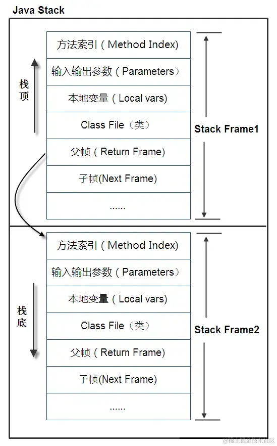 每个方法在运行时都会同时创建一个栈帧,用于存储局部变量表、操作栈、动态链接、方法出口等消息。每一个方法被调用直至执行完成的过程,就对应着一个栈桢在虚拟机栈中从入栈到出栈的过程。